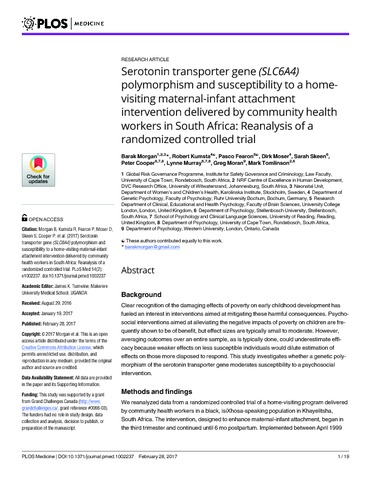 Morgan, B., Kumsta, R., Fearon, P., Moser, D., Skeen, S., Cooper, P., Murray, L., Moran, G. and Tomlinson, M. (2017) Serotonin transporter gene (SLC6A4) polymorphism and susceptibility to a home-visiting maternal-infant attachment intervention delivered by community health workers in South Africa: reanalysis of a randomized controlled trial. PLoS Medicine, 14 (2). e1002237.. ISSN 1549-1676 doi: 10.1371/journal.pmed.1002237