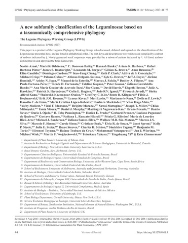The classification of the legume family proposed here addresses the long-known non-monophyly of the traditionally recognised subfamily Caesalpinioideae, by recognising six robustly supported monophyletic subfamilies. This new classification uses as its framework the most comprehensive phylogenetic analyses of legumes to date, based on plastid matK gene sequences, and including near-complete sampling of genera (698 of the currently recognised 765 genera) and ca. 20% (3696) of known species. The matK gene region has been the most widely sequenced across the legumes, and in most legume lineages, this gene region is sufficiently variable to yield well-supported clades. This analysis resolves the same major clades as in other phylogenies of whole plastid and nuclear gene sets (with much sparser taxon sampling). Our analysis improves upon previous studies that have used large phylogenies of the Leguminosae for addressing evolutionary questions, because it maximises generic sampling and provides a phylogenetic tree that is based on a fully curated set of sequences that are vouchered and taxonomically validated. The phylogenetic trees obtained and the underlying data are available to browse and download, facilitating subsequent analyses that require evolutionary trees. Here we propose a new community-endorsed classification of the family that reflects the phylogenetic structure that is consistently resolved and recognises six subfamilies in Leguminosae: a recircumscribed Caesalpinioideae DC., Cercidoideae Legume Phylogeny Working Group (stat. nov.), Detarioideae Burmeist., Dialioideae Legume Phylogeny Working Group (stat. nov.), Duparquetioideae Legume Phylogeny Working Group (stat. nov.), and Papilionoideae DC. The traditionally recognised subfamily Mimosoideae is a distinct clade nested within the recircumscribed Caesalpinioideae and is referred to informally as the mimosoid clade pending a forthcoming formal tribal and/or cladebased classification of the new Caesalpinioideae. We provide a key for subfamily identification, descriptions with diagnostic charactertistics for the subfamilies, figures illustrating their floral and fruit diversity, and lists of genera by subfamily. This new classification of Leguminosae represents a consensus view of the international legume systematics community; it invokes both compromise and practicality of use.