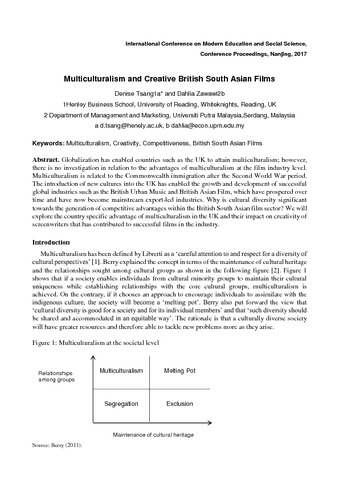 Tsang, D. and Zawawi, D. (2017) Multiculturalism and creative British South Asian films. In: 3rd International Conference on Modern Education and Social Science, 21-23 April, 2017, Nanjing, China.