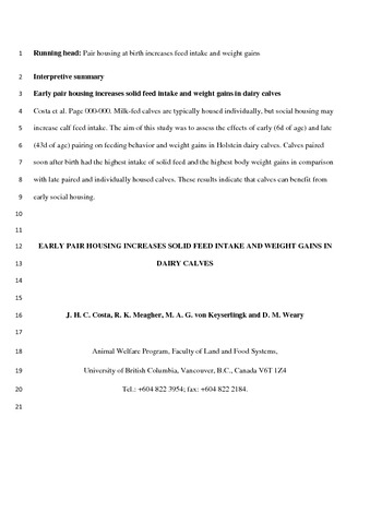 Costa, J. H. C., Meagher, R. K., von Keyserlingk, M. A. G. and Weary, D. M. (2015) Early pair housing increases solid feed intake and weight gains in dairy calves. Journal of Dairy Science, 98 (9). pp. 6381-6386. ISSN 0022-0302 doi: 10.3168/jds.2015-9395