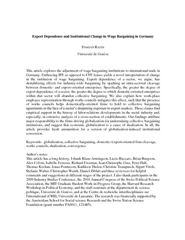 This article explores the adjustment of wage bargaining institutions to international trade in Germany. Embracing IPE as opposed to CPE lenses yields a novel interpretation of change in the institution of wage bargaining. Export dependence of a sector, we argue, has destabilizing effects for industry-wide bargaining by sparking an intra-sectoral cleavage between domestic- and export-oriented enterprises. Specifically, the greater the degree of export dependence of a sector, the greater the degree to which domestic-oriented enterprises within that sector will abandon collective bargaining. We also explain how work-place employee representation through works councils mitigates this effect, such that the presence of works councils helps domestically-oriented firms to hold to collective bargaining agreements in the face of a sector’s deepening exposure to export markets. These claims find empirical support in the history of labor-relations developments in the metal industry and, especially, in extensive analysis of a cross-section of establishments. Our findings attribute major responsibility to the firms driving globalization for undermining collective bargaining institutions, and suggest that economic globalization is a cause of dualization. In all, the article provides fresh ammunition for a version of globalization-induced institutional conversion.