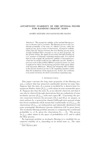 Bröcker, J. and Del Magno, G. (2017) Asymptotic stability of the optimal filter for random chaotic maps. Nonlinearity, 30 (5). pp. 1809-1833. ISSN 1361-6544 doi: 10.1088/1361-6544/aa639c