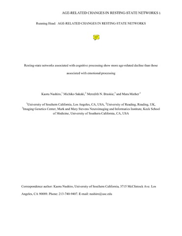 Resting-state networks associated with cognitive processing show more age-related decline than those associated with emotional processing.