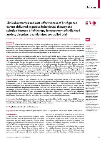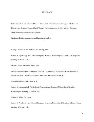 Creswell, C., Violato, M., Fairbanks, H., White, E., Parkinson, M., Abitabile, G., Leidi, A. and Cooper, P. J. (2017) Clinical outcomes and cost-effectiveness of brief guided parent-delivered cognitive behavioural therapy and solution-focused brief therapy for treatment of childhood anxiety disorders: a randomised controlled trial. The Lancet Psychiatry, 4 (7). pp. 529-539. ISSN 2215-0366 doi: 10.1016/S2215-0366(17)30149-9