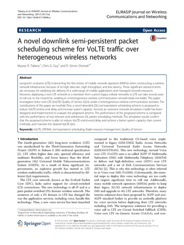 Tabany, M. R., Guy, C. G. and Sherratt, R. S. orcid id iconORCID: https://orcid.org/0000-0001-7899-4445 (2017) A novel downlink semi-persistent packet scheduling scheme for VoLTE traffic over heterogeneous wireless networks. EURASIP Journal on Wireless Communications and Networking, 2017. 62. ISSN 1687-1499 doi: 10.1186/s13638-017-0846-y