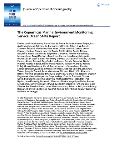 von Schuckmann, K., Le Traon, P.-Y., Alvarez-Fanjul, E., Axell, L., Balmaseda, M., Breivik, L.-A., Brewin, R. J. W., Bricaud, C., Drevillon, M., Drillet, Y., Dubois, C., Embury, O. orcid id iconORCID: https://orcid.org/0000-0002-1661-7828, Etienne, H., Sotillo, M. G., Garric, G., Gasparin, F., Gutknecht, E., Guinehut, S., Hernandez, F., Juza, M., Karlson, B., Korres, G., Legeais, J.-F., Levier, B., Lien, V. S., Morrow, R., Notarstefano, G., Parent, L., Pascual, Á., Pérez-Gómez, B., Perruche, C., Pinardi, N., Pisano, A., Poulain, P.-M., Pujol, I. M., Raj, R. P., Raudsepp, U., Roquet, H., Samuelsen, A., Sathyendranath, S., She, J., Simoncelli, S., Solidoro, C., Tinker, J., Tintoré, J., Viktorsson, L., Ablain, M., Almroth-Rosell, E., Bonaduce, A., Clementi, E., Cossarini, G., Dagneaux, Q., Desportes, C., Dye, S., Fratianni, C., Good, S., Greiner, E., Gourrion, J., Hamon, M., Holt, J., Hyder, P., Kennedy, J., Manzano-Muñoz, F., Melet, A., Meyssignac, B., Mulet, S., Buongiorno Nardelli, B., O’Dea, E., Olason, E., Paulmier, A., Pérez-González, I., Reid, R., Racault, M.-F., Raitsos, D. E., Ramos, A., Sykes, P., Szekely, T. and Verbrugge, N. (2017) The Copernicus Marine Environment Monitoring Service Ocean State Report. Journal of Operational Oceanography, 9 (sup2). s235-s320. ISSN 1755-8778 doi: 10.1080/1755876X.2016.1273446
