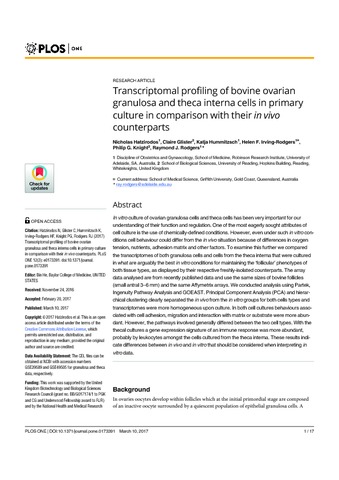 Hatzirodos, N., Glister, C., Hummitzsch, K., Irving-Rodgers, H., Knight, P. G. orcid id iconORCID: https://orcid.org/0000-0003-0300-1554 and Rodgers, R. (2017) Transcriptomal profiling of bovine ovarian granulosa and theca interna cells in primary culture in comparison with their in vivo counterparts. PLoS ONE, 12 (3). e0173391. ISSN 1932-6203 doi: 10.1371/journal.pone.0173391