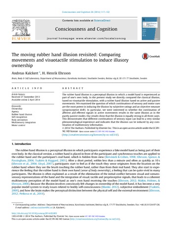 Kalckert, A. and Ehrsson, H. (2014) The moving rubber hand illusion revisited: comparing movements and visuotactile stimulation to induce illusory ownership. Consciousness and Cognition, 26. pp. 117-132. ISSN 1053-8100 doi: 10.1016/j.concog.2014.02.003