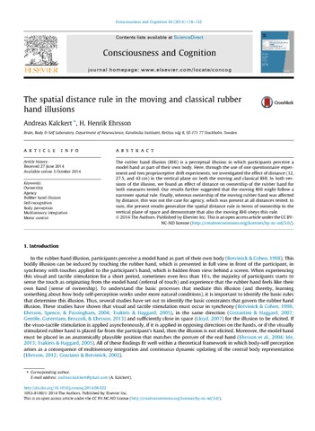 Kalckert, A. and Ehrsson, H. (2014) The spatial distance rule in the moving and classical rubber hand illusions. Consciousness and Cognition, 30. pp. 118-132. ISSN 1053-8100 doi: 10.1016/j.concog.2014.08.022