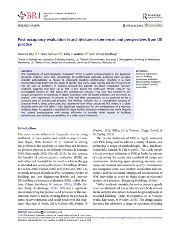 Hay, R., Samuel, F., Watson, K. J. and Bradbury, S. (2018) Post occupancy evaluation in architecture: experiences and perspectives from UK practice. Building Research and Information, 46 (6). pp. 698-710. ISSN 1466-4321 doi: 10.1080/09613218.2017.1314692