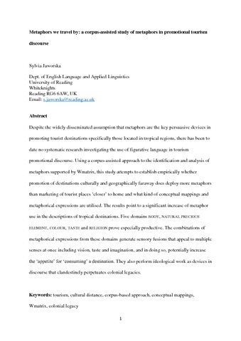 Despite the widely disseminated assumption that metaphors are the key persuasive devices in promoting tourist destinations specifically those located in tropical regions, there has been to date no systematic research investigating the use of figurative language in tourism promotional discourse. Using a corpus-assisted approach to the identification and analysis of metaphors supported by Wmatrix, this study attempts to establish empirically whether promotion of destinations culturally and geographically faraway does deploy more metaphors than marketing of tourist places ‘closer’ to home and what kind of conceptual mappings and metaphorical expressions are utilised. The results point to a significant increase of metaphor use in the descriptions of tropical destinations. Five domains BODY, NATURAL PRECIOUS ELEMENT, COLOUR, TASTE and RELIGION prove especially productive. The combinations of metaphorical expressions from these domains generate sensory fusions that appeal to multiple senses at once including vision, taste and imagination, and in doing so, potentially increase the ‘appetite’ for ‘consuming’ a destination. They also perform ideological work as devices in discourse that clandestinely perpetuates colonial legacies.