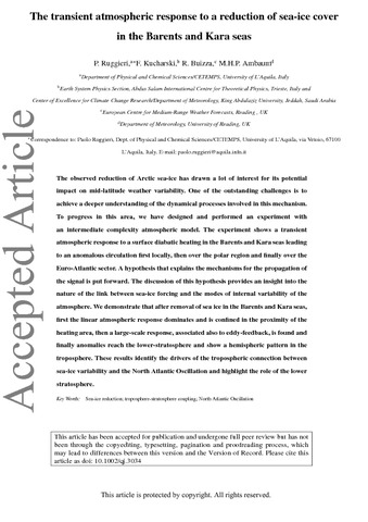 Ruggieri, P., Kucharski, F., Buizza, R. and Ambaum, M. H. P. orcid id iconORCID: https://orcid.org/0000-0002-6824-8083 (2017) The transient atmospheric response to a reduction of sea-ice cover in the Barents and Kara seas. Quarterly Journal of the Royal Meteorological Society, 143 (704). pp. 1632-1640. ISSN 1477-870X doi: 10.1002/qj.3034 (Part A)