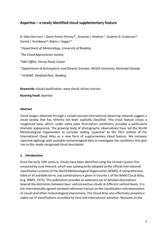 Cloud images obtained through a crowd-sourced international observing network suggest a cloud variety that has hitherto not been explicitly classified. This cloud feature shows a roughened base, which, under some solar illumination conditions, provides a particularly dramatic appearance. The growing body of photographic observations have led the World Meteorological Organisation to consider adding ‘asperitas’ to the 2017 edition of the International Cloud Atlas as a new form of supplementary cloud feature. We compare reported sightings with available meteorological data to investigate the conditions that give rise to this newly recognised cloud description.