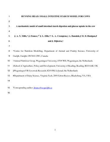 Mills, J. A. N., France, J., Ellis, J. L., Crompton, L. A., Bannink, A., Hanigan, M. D. and Dijkstra, J. (2017) A mechanistic model of small intestinal starch digestion and glucose uptake in the cow. Journal of Dairy Science, 100 (6). pp. 4650-4670. ISSN 0022-0302 doi: 10.3168/jds.2016-12122
