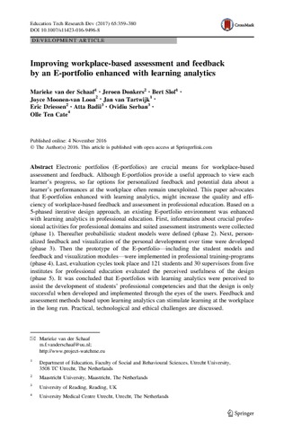 van der Schaaf, M., Donkers, J., Slof, B., Moonen-van Loon, J., van Tartwijk, J., Driessen, E., Badii, A., Serban, O. and Ten Cate, O. (2017) Improving workplace-based assessment and feedback by an E-portfolio enhanced with learning analytics. Educational Technology Research and Development, 65 (2). pp. 359-380. ISSN 1556-6501 doi: 10.1007/s11423-016-9496-8
