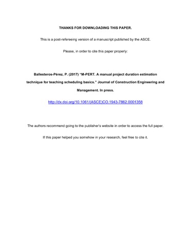 Ballesteros-Pérez, P. (2017) M-PERT: manual project-duration estimation technique for teaching scheduling basics. Journal of Construction Engineering and Management, 143 (9). 04017063. ISSN 0733-9364 doi: 10.1061/(ASCE)CO.1943-7862.0001358