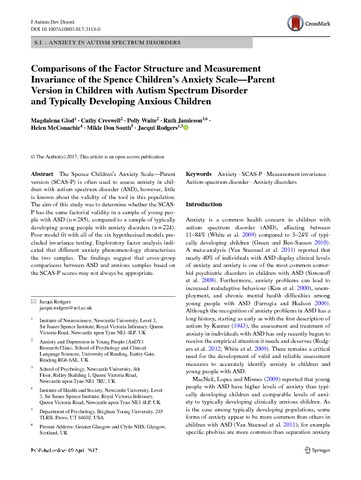 Comparisons of the factor structure and measurement invariance of the Spence children’s anxiety scale - parent version in children with autism spectrum disorder and typically developing anxious children.