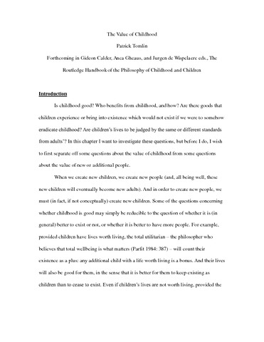 Tomlin, P. (2018) The value of childhood. In: Gheaus, A., Calder, G. and De Wispelaere, J. (eds.) The Routledge Handbook of the Philosophy of Childhood and Children. Routledge, Abingdon. ISBN 9781138915978