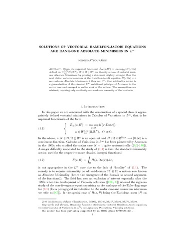 Katzourakis, N. (2019) Solutions of vectorial Hamilton-Jacobi equations are rank-one absolute minimisers in L∞. Advances in Nonlinear Analysis, 8 (1). pp. 508-516. ISSN 2191-950X doi: 10.1515/anona-2016-0164
