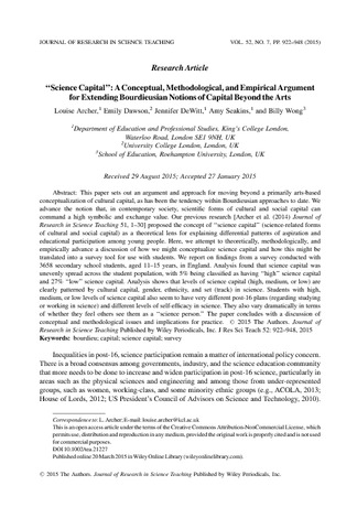 “Science capital”: a conceptual, methodological, and empirical argument for extending bourdieusian notions of capital beyond the arts.