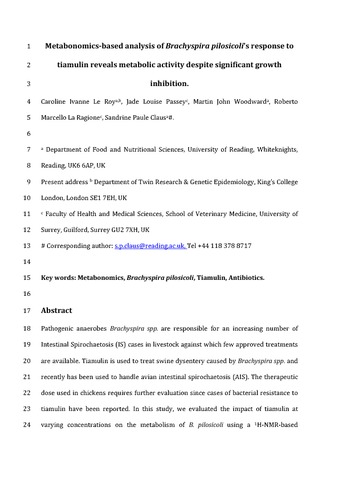 Le Roy, C. I., Passey, J. L., Woodward, M. J., La Ragione, R. M. and Claus, S. P. (2017) Metabonomics-based analysis of Brachyspira pilosicoli's response to tiamulin reveals metabolic activity despite significant growth inhibition. Anaerobe, 45. pp. 71-77. ISSN 1075-9964 doi: 10.1016/j.anaerobe.2017.03.018