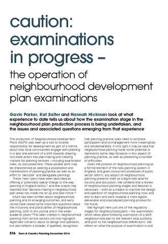 Caution: examinations in progress - the operation of neighbourhood plan examinations in England.