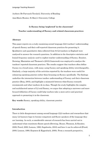 Is fluency being ‘neglected’ in the classroom? Teacher understanding of fluency and related classroom practices.