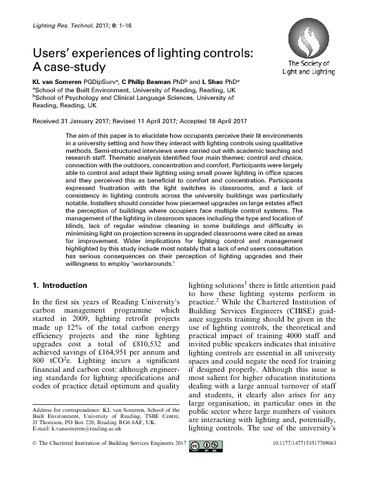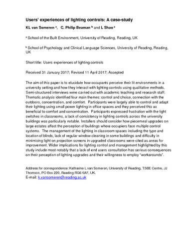 The aim of this paper is to elucidate how occupants perceive their lit environments in a university setting and how they interact with lighting controls using qualitative methods. Semi-structured interviews were carried out with academic teaching and research staff. Thematic analysis identified four main themes: control and choice, connection with the outdoors, concentration, and comfort. Participants were largely able to control and adapt their lighting using small power lighting in office spaces and they perceived this as beneficial to comfort and concentration. Participants expressed frustration with the light switches in classrooms, a lack of consistency in lighting controls across the university buildings was particularly notable. Installers should consider how piecemeal upgrades on large estates affect the perception of buildings where occupiers face multiple control systems. The management of the lighting in classroom spaces including the type and location of blinds, lack of regular window cleaning in some buildings and difficulty in minimising light on projection screens in upgraded classrooms were cited as areas for improvement. Wider implications for lighting control and management highlighted by this study include most notably that a lack of end users consultation has serious consequences on their perception of lighting upgrades and their willingness to employ “workarounds”.