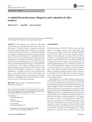 Nawaz, T., Ellis, A. and Ferryman, J. (2017) A method for performance diagnosis and evaluation of video trackers. Signal, Image and Video Processing, 11 (7). pp. 1287-1295. ISSN 1863-1703 doi: 10.1007/s11760-017-1086-7