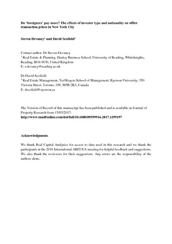 Do ‘foreigners’ pay more? The effects of investor type and nationality on office transaction prices in New York City.