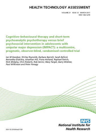 Goodyer, I. M., Reynolds, S., Barrett, B., Byford, S., Dubicka, B., Hill, J., Holland, F., Kelvin, R., Midgley, N., Roberts, C., Senior, R., Target, M., Widmer, B., Wilkinson, P. and Fonagy, P. (2017) Cognitive-behavioural therapy and short-term psychoanalytic psychotherapy versus brief psychosocial intervention in adolescents with unipolar major depression (IMPACT): a multicentre, pragmatic, observer-blind, randomised controlled trial. Health Technology Assessment, 21 (12). pp. 1-94. ISSN 1366-5278 doi: 10.3310/hta21120