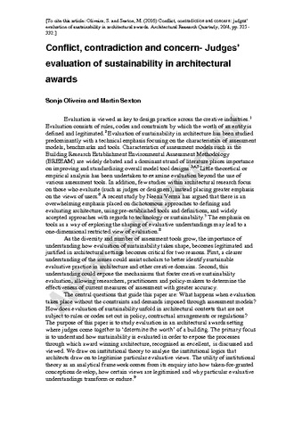Oliveira, S. and Sexton, M. (2016) Conflict, contradiction and concern: judges’ evaluation of sustainability in architectural awards. Architectural Research Quarterly, 20 (4). pp. 325-332. ISSN 1359-1355 doi: 10.1017/s1359135517000069
