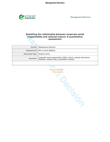 Halkos, G. and Skouloudis, A. (2017) Revisiting the relationship between corporate social responsibility and national culture: a quantitative assessment. Management Decision, 55 (3). pp. 595-613. ISSN 0025-1747 doi: 10.1108/MD-12-2016-0868