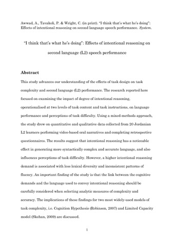 Awwad, A., Tavakoli, P. orcid id iconORCID: https://orcid.org/0000-0003-0807-3709 and Wright, C. (2017) “I think that’s what he’s doing”: effects of intentional reasoning on second language (L2) speech performance. System, 67. pp. 158-169. ISSN 0346-251X doi: 10.1016/j.system.2017.05.002