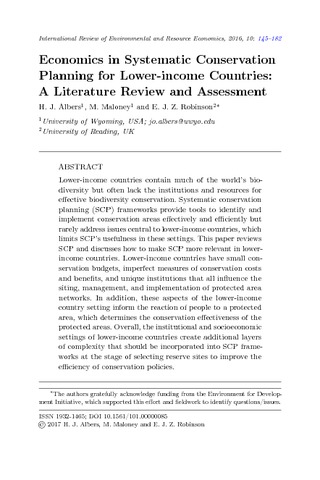 Lower-income countries contain much of the world’s biodiversity but often lack the institutions and resources for effective biodiversity conservation. Systematic conservation planning (SCP) frameworks provide tools to identify and implement conservation areas effectively and efficiently but rarely address issues central to lower-income countries, which limits SCP’s usefulness in these settings. This paper reviews SCP and discusses how to make SCP more relevant in lowerincome countries. Lower-income countries have small conservation budgets, imperfect measures of conservation costs and benefits, and unique institutions that all influence the siting, management, and implementation of protected area networks. In addition, these aspects of the lower-income country setting inform the reaction of people to a protected area, which determines the conservation effectiveness of the protected areas. Overall, the institutional and socioeconomic settings of lower-income countries create additional layers of complexity that should be incorporated into SCP frameworks at the stage of selecting reserve sites to improve the efficiency of conservation policies.
