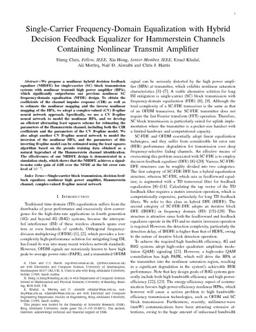 Single-carrier frequency-domain equalization with hybrid decision feedback equalizer for Hammerstein channels containing nonlinear transmit amplifier.