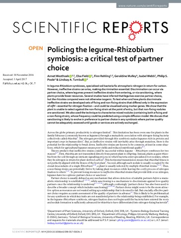 Westhoek, A., Field, E., Rehling, F., Mulley, G. orcid id iconORCID: https://orcid.org/0000-0003-0650-478X, Webb, I., Poole, P. S. and Turnbull, L. A. (2017) Policing the legume-Rhizobium symbiosis: a critical test of partner choice. Scientific reports, 7 (1). 1419. ISSN 2045-2322 doi: 10.1038/s41598-017-01634-2