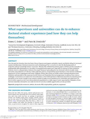 Duke, D. C. and Denicolo, P. M. (2017) What supervisors and universities can do to enhance doctoral student experience (and how they can help themselves). FEMS Microbiology Letters, 364 (9). fnx090. ISSN 1574-6968 doi: 10.1093/femsle/fnx090