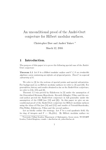 An unconditional proof of the Andre-Oort conjecture for Hilbert modular surfaces.