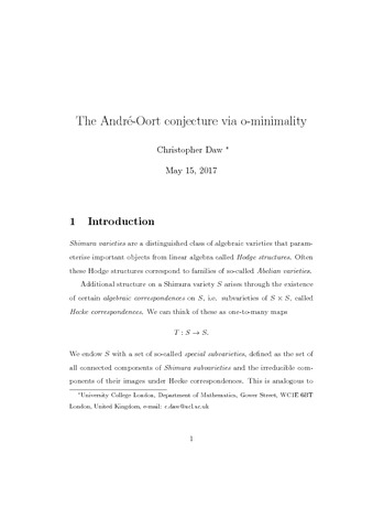 Daw, C. orcid id iconORCID: https://orcid.org/0000-0002-2488-6729 (2015) The Andre-Oort conjecture via o-minimality. In: Jones, G. O. and Wilkie, A. J. (eds.) O-Minimality and Diophantine Geometry. London Mathematical Society Lecture Note Series (421). Cambridge University Press, pp. 129-158. ISBN 9781316106839 doi: 10.1017/CBO9781316106839.006