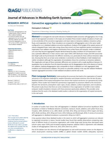 Holloway, C. E. orcid id iconORCID: https://orcid.org/0000-0001-9903-8989 (2017) Convective aggregation in realistic convective-scale simulations. Journal of Advances in Modeling Earth Systems, 9 (2). pp. 1450-1472. ISSN 1942-2466 doi: 10.1002/2017MS000980