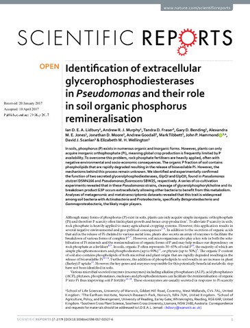 Lidbury, I. D. E. A., Murphy, A. R. J., Fraser, T. D., Bending, G. D., Jones, A. M. E., Moore, J. D., Goodall, A., Tibbett, M. orcid id iconORCID: https://orcid.org/0000-0003-0143-2190, Hammond, J. P. orcid id iconORCID: https://orcid.org/0000-0002-6241-3551, Scanlan, D. J. and Wellington, E. M. H. (2017) Identification of extracellular glycerophosphodiesterases in Pseudomonas and their role in soil organic phosphorus remineralisation. Scientific Reports, 7 (1). 2179. ISSN 2045-2322 doi: 10.1038/s41598-017-02327-6