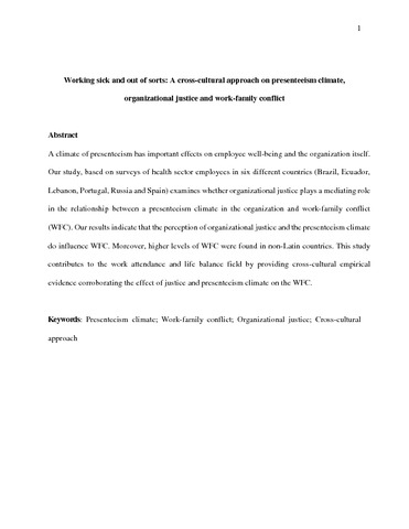 A climate of presenteeism has important effects on employee well-being and the organization itself. Our study, based on surveys of health sector employees in six different countries (Brazil, Ecuador, Lebanon, Portugal, Russia and Spain) examines whether organizational justice plays a mediating role in the relationship between a presenteeism climate in the organization and work-family conflict (WFC). Our results indicate that the perception of organizational justice and the presenteeism climate do influence WFC. Moreover, higher levels of WFC were found in non-Latin countries. This study contributes to the work attendance and life balance field by providing cross-cultural empirical evidence corroborating the effect of justice and presenteeism climate on the WFC.