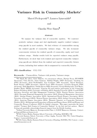Prokopczuk, M., Symeonidis, L. and Wese Simen, C. (2017) Variance risk in commodity markets. Journal of Banking and Finance, 81. pp. 136-149. ISSN 0378-4266 doi: 10.1016/j.jbankfin.2017.05.003