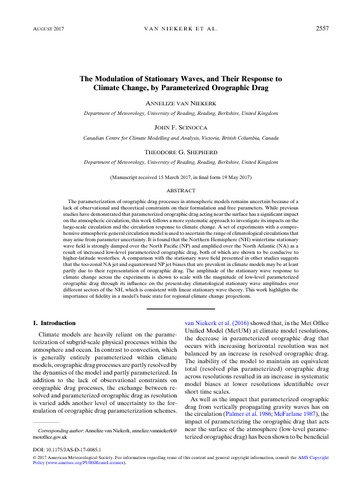 van Niekerk, A., Scinocca, J. F. and Shepherd, T. G. orcid id iconORCID: https://orcid.org/0000-0002-6631-9968 (2017) The modulation of stationary waves, and their response to climate change, by parameterized orographic drag. Journal of the Atmospheric Sciences, 74 (8). pp. 2557-2574. ISSN 1520-0469 doi: 10.1175/JAS-D-17-0085.1