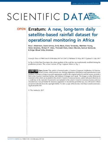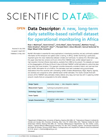 Maidment, R. I. orcid id iconORCID: https://orcid.org/0000-0003-2054-3259, Grimes, D., Black, E. orcid id iconORCID: https://orcid.org/0000-0003-1344-6186, Tarnavsky, E. orcid id iconORCID: https://orcid.org/0000-0003-3403-0411, Young, M., Greatrex, H., Allan, R. P. orcid id iconORCID: https://orcid.org/0000-0003-0264-9447, Stein, T. orcid id iconORCID: https://orcid.org/0000-0002-9215-5397, Nkonde, E., Senkunda, S. and Alcántara, E. M. U. (2017) A new, long-term daily satellite-based rainfall dataset for operational monitoring in Africa. Scientific Data, 4. 170063. ISSN 2052-4463 doi: 10.1038/sdata.2017.63