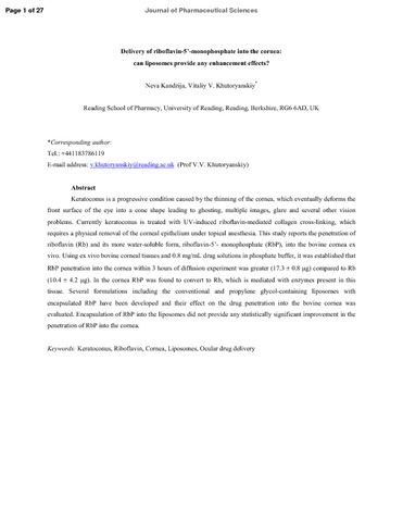 Keratoconus is a progressive condition caused by the thinning of the cornea, which eventually deforms the front surface of the eye into a cone shape leading to ghosting, multiple images, glare and several other vision problems. Currently keratoconus is treated with UV-induced ribofiavin-mediated collagen cross-linking, which requires a physical removal of the corneal epithelium under topical anesthesia. This study reports the penetration of riboflavin (Rb) and its more water-soluble form, riboflavin-5’- monophosphate (RbP), into the bovine cornea ex vivo. Using ex vivo bovine corneal tissues and 0.8 mg/mL drug solutions in phosphate buffer, it was established that RbP penetration into the cornea within 3 hours of diffusion experiment was greater (17.3 ± 0.8 μg) compared to Rb (10.4 ± 4.2 μg). In the cornea RbP was found to convert to Rb, which is mediated with enzymes present in this tissue. Several formulations including the conventional and propylene glycol-containing liposomes with encapsulated RbP have been developed and their effect on the drug penetration into the bovine cornea was evaluated. Encapsulation of RbP into the liposomes did not provide any statistically significant improvement in the penetration of RbP into the cornea.