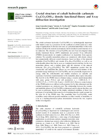 Crystal structure of cobalt hydroxide carbonate Co2CO3(OH)2: density functional theory and X-ray diffraction investigation.