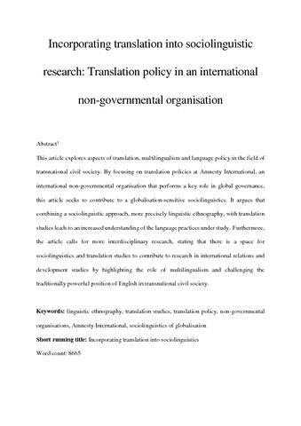 • Tesseur, Wine. 2014. Transformation through Translation: Translation Policies at Amnesty International. Unpublished PhD Thesis. Aston University, Birmingham.