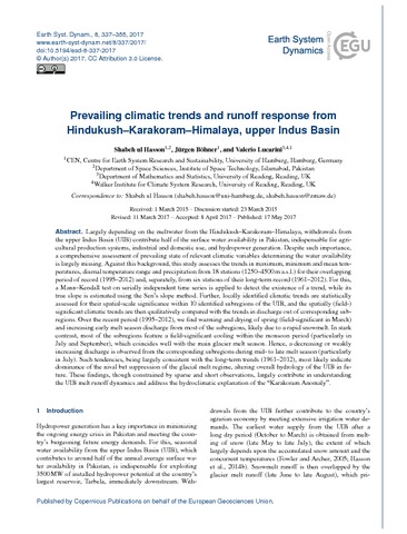Hasson, S., Böhner, J. and Lucarini, V. orcid id iconORCID: https://orcid.org/0000-0001-9392-1471 (2017) Prevailing climatic trends and runoff response from Hindukush–Karakoram–Himalaya, upper Indus Basin. Earth System Dynamics, 8 (2). pp. 337-355. ISSN 2190-4987 doi: 10.5194/esd-8-337-2017